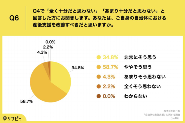 「Q6.Q4で「全く十分だと思わない」「あまり十分だと思わない」と回答した方にお聞きします。あなたは、ご自身の自治体における産後支援を改善すべきだと思いますか。」という質問に対して、「非常にそう思う」が34.8%、「ややそう思う」が58.7%という回答となった。