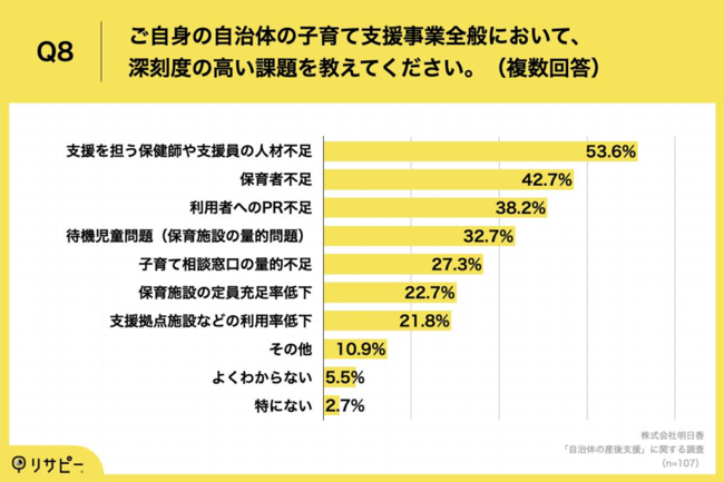「Q8.ご自身の自治体の子育て支援事業全般において、深刻度の高い課題を教えてください。(複数回答)」という質問に対して、「支援を担う保健師や支援員の人材不足」が53.6%、「保育者不足」が42.7%、「利用者へのPR不足」が38.2%という回答となった。