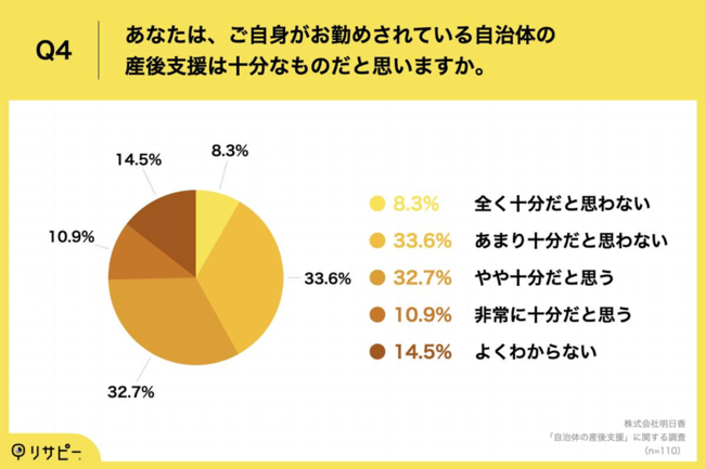 「Q4.あなたは、ご自身がお勤めされている自治体の産後支援は十分なものだと思いますか。」という質問に対して、「全く十分だと思わない」が8.3%、「あまり十分だと思わない」が33.6%という回答となった。