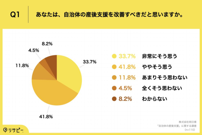 「Q1.あなたは、自治体の産後支援を改善すべきだと思いますか。」の質問に対して「非常にそう思う」が33.7%、「ややそう思う」が41.8%という回答となった。