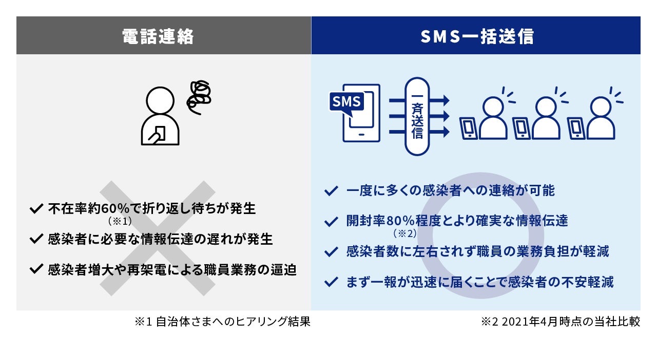 自治体や医療機関においては現在新型コロナウイルス感染者への連絡の際、電話を主な連絡手段として利用しているが、①電話連絡時の高い不在率を受けて折り返し待ちが発生、②電話応対の遅れによって必要な情報伝達の遅れが発生、③感染者数の増大や再架電によって職員業務が逼迫、といった課題が生じている。