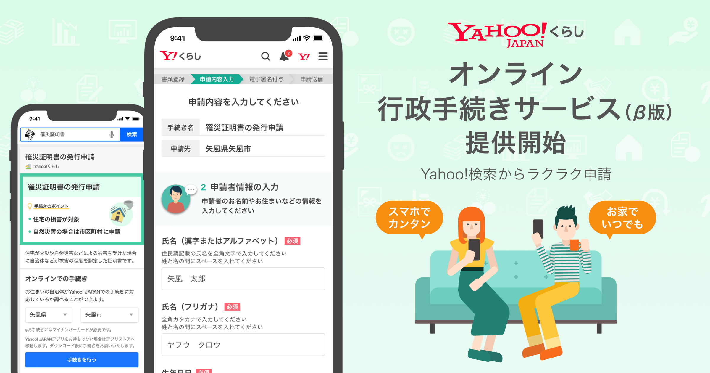 ユーザーは、Yahoo!JAPANにログインすることで、「Yahoo!検索」で「罹災証明」や「介護手当」などの行政手続きのキーワードで検索をすれば、Yahoo! JAPAN IDの登録住所から自動で自治体を判定し、自治体別のオンライン申請に進むことが出来る。また、申請に必要な氏名や住所なども、Yahoo! JAPAN IDの登録情報から自動で入力されるため、申請作業の負荷が軽減される。