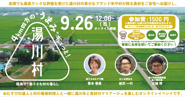 イベントでは、湯川村の特選食材を事前に自宅にお届けし、村の看板料理人による”湯川村のうまみギュっと飯”レシピの限定公開や、湯川米を使ったおむすびづくりの体験を行う。また、「村編」「暮らし編」「食編」の3つのトークテーマに分け、ここでしか聞けない湯川村のうまみトークを開催。イベントの後半には、参加者とゲストでつくったおむすびを食べながら、ゲストへの質問や、地元のうまみ(魅力)をお話する交流会を行う。